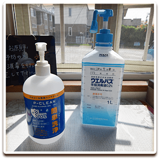 - 玄関に手指用アルコール消毒液の設置
